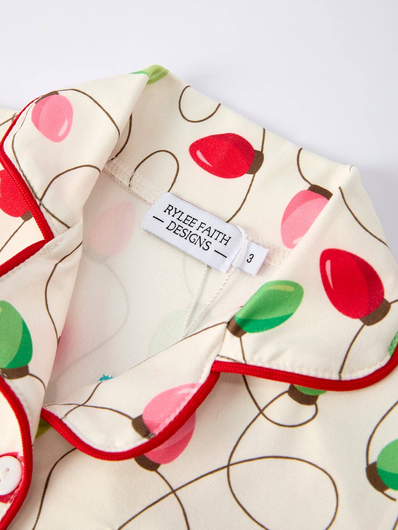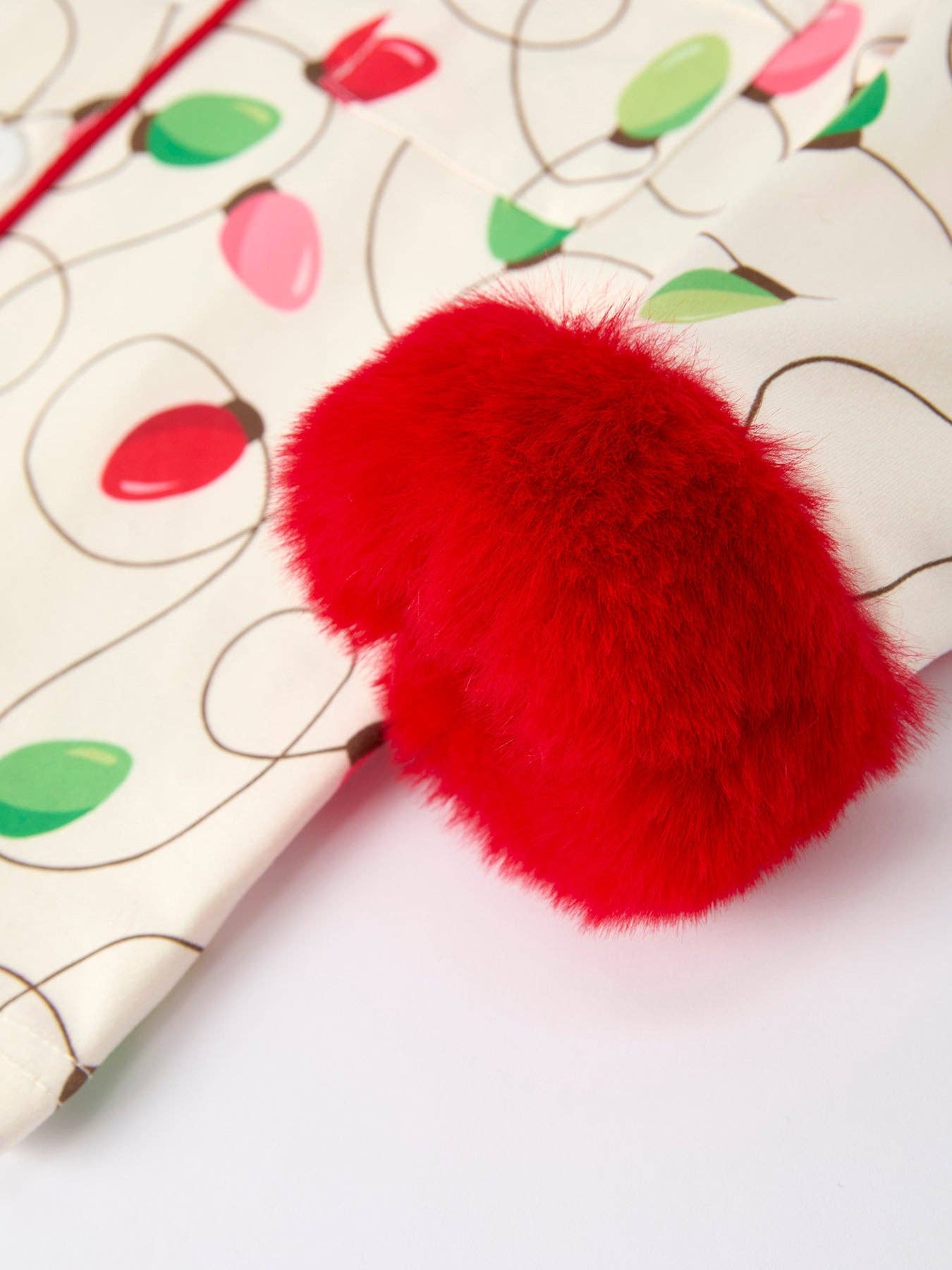 Christmas Lights Print Pajamas Set with Red Furry Trim Long Sleeve Top and Pants