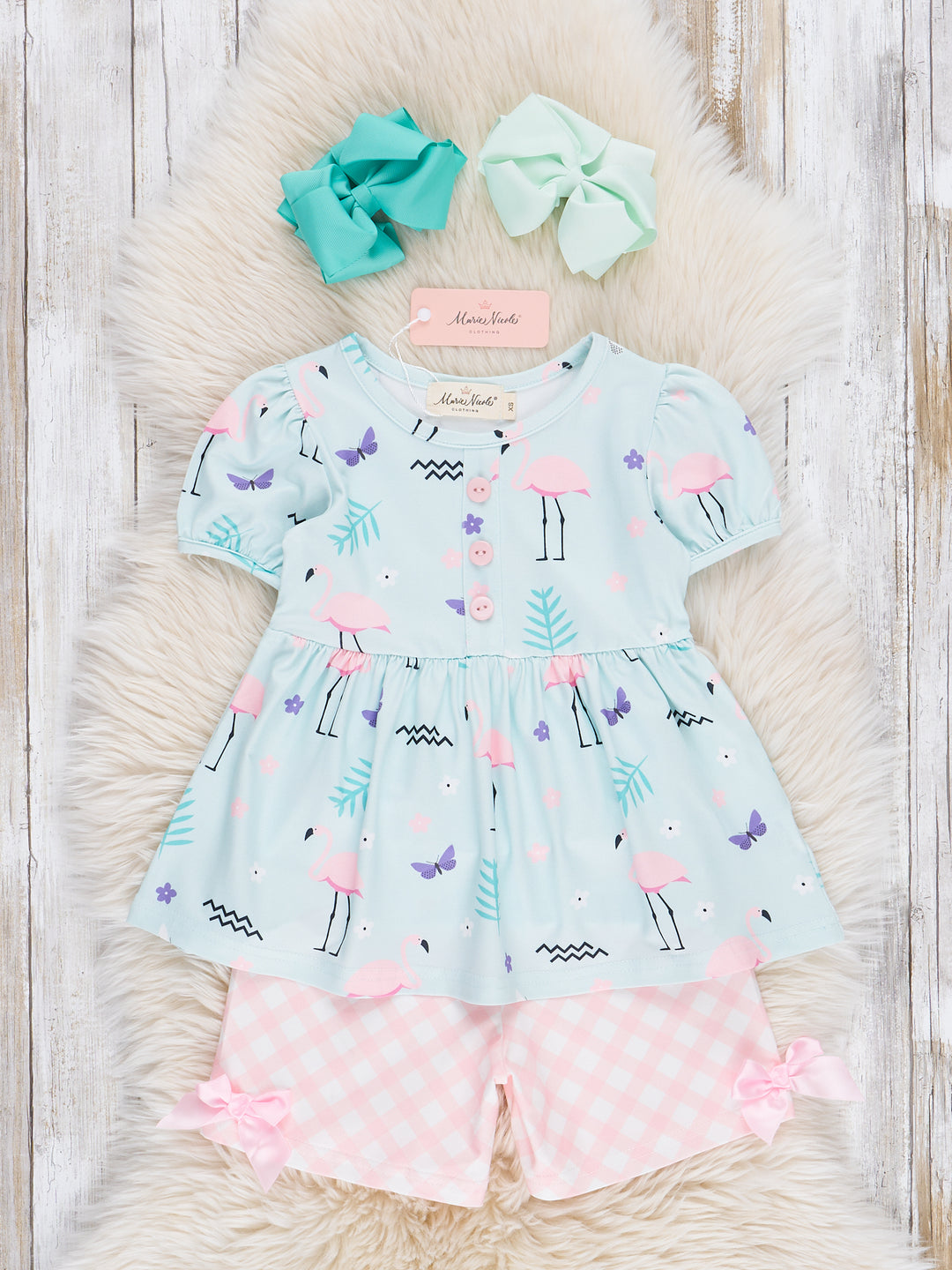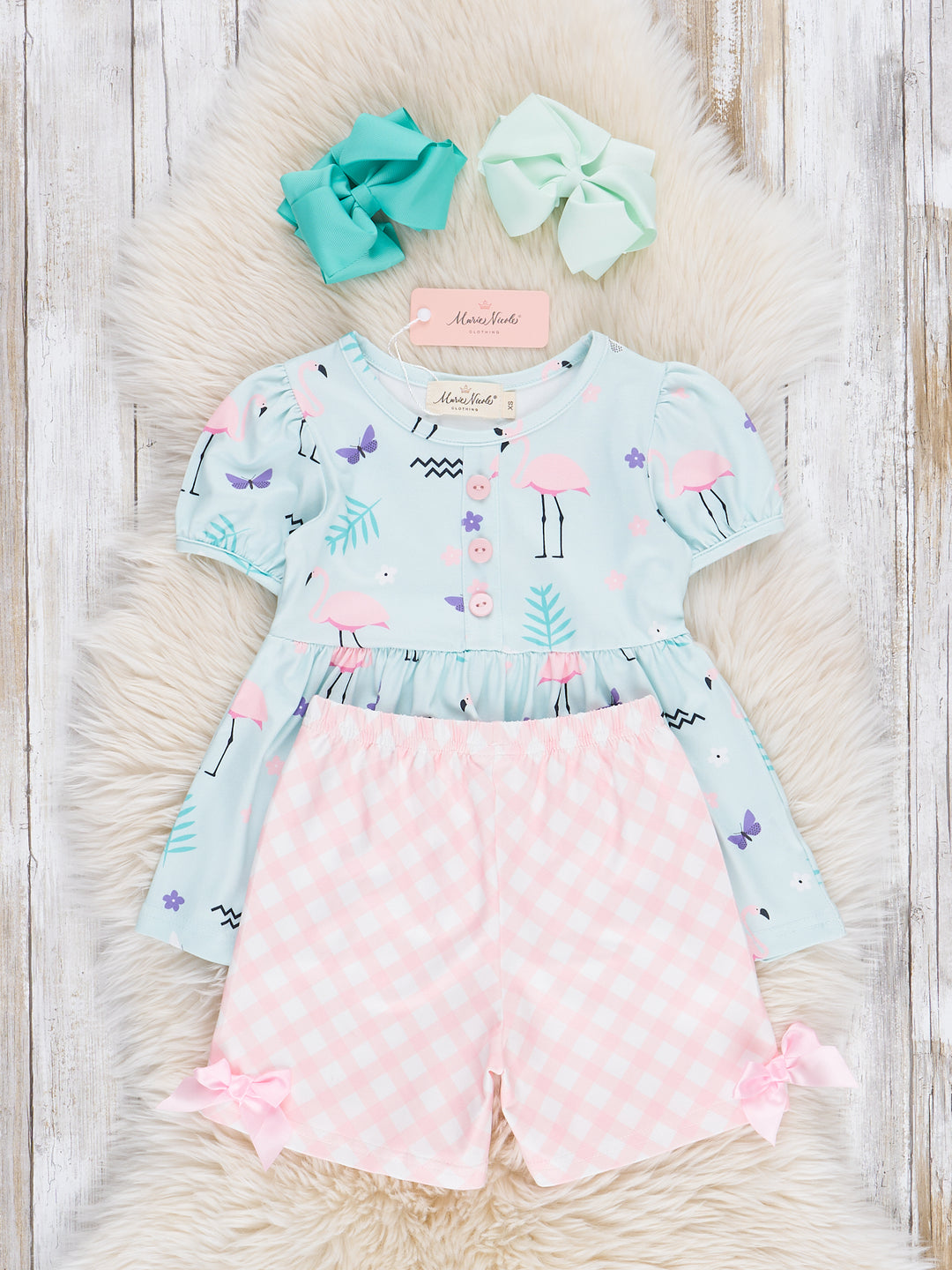 Get ready for a tropical getaway with our Flamingo Paradise Tiered Outfit! This girls shorts set features a playful flamingo print top with a cute Peter Pan collar and matching pink plaid bow accented shorts. Perfect for sisters who want to match on vacation. This outfit is perfect for summer!