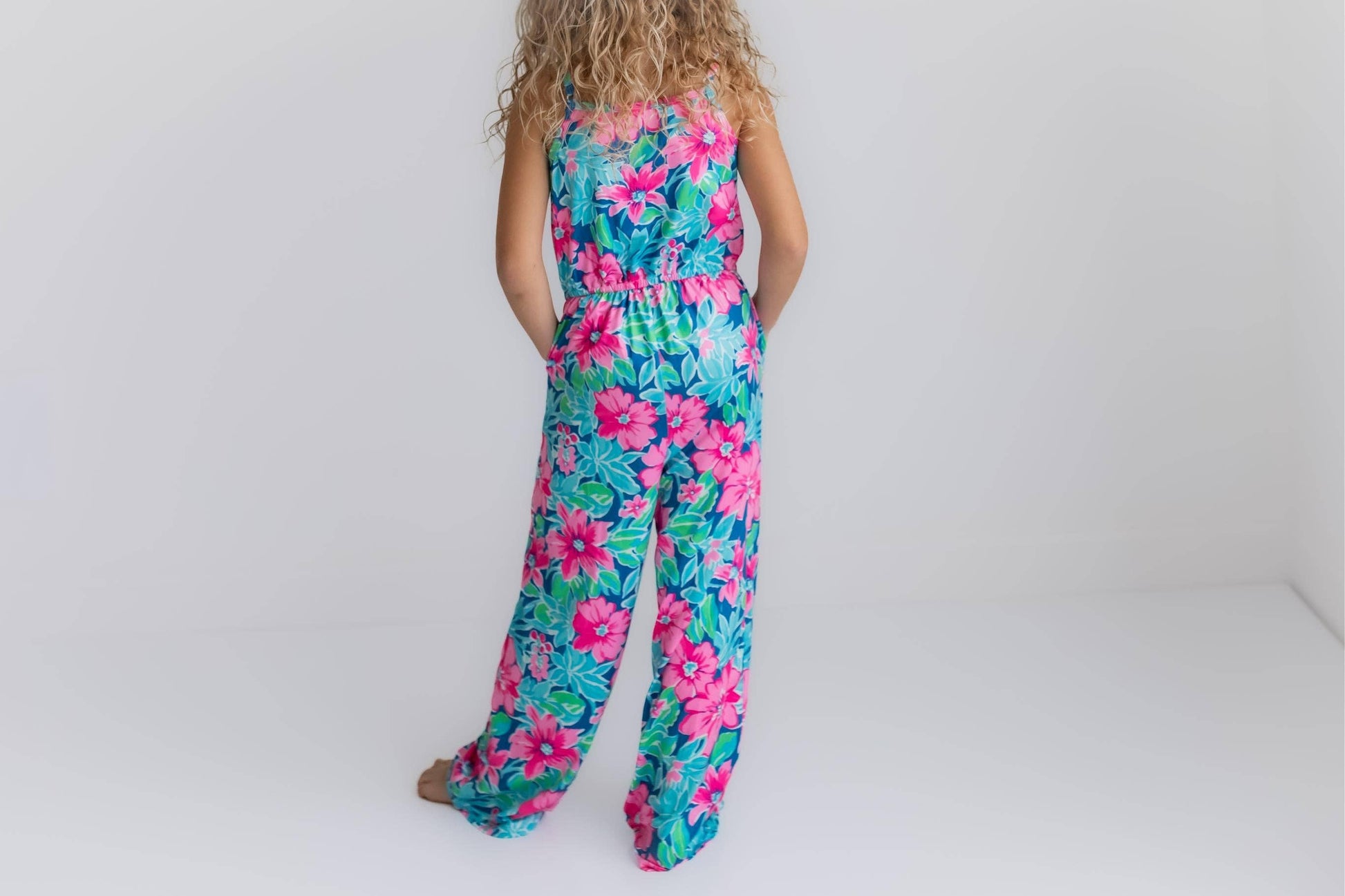 Girls bright blue and pink tropical floral print jumpsuit with adjustable spaghetti straps and pockets. Perfect for Spring Easter & Summer!