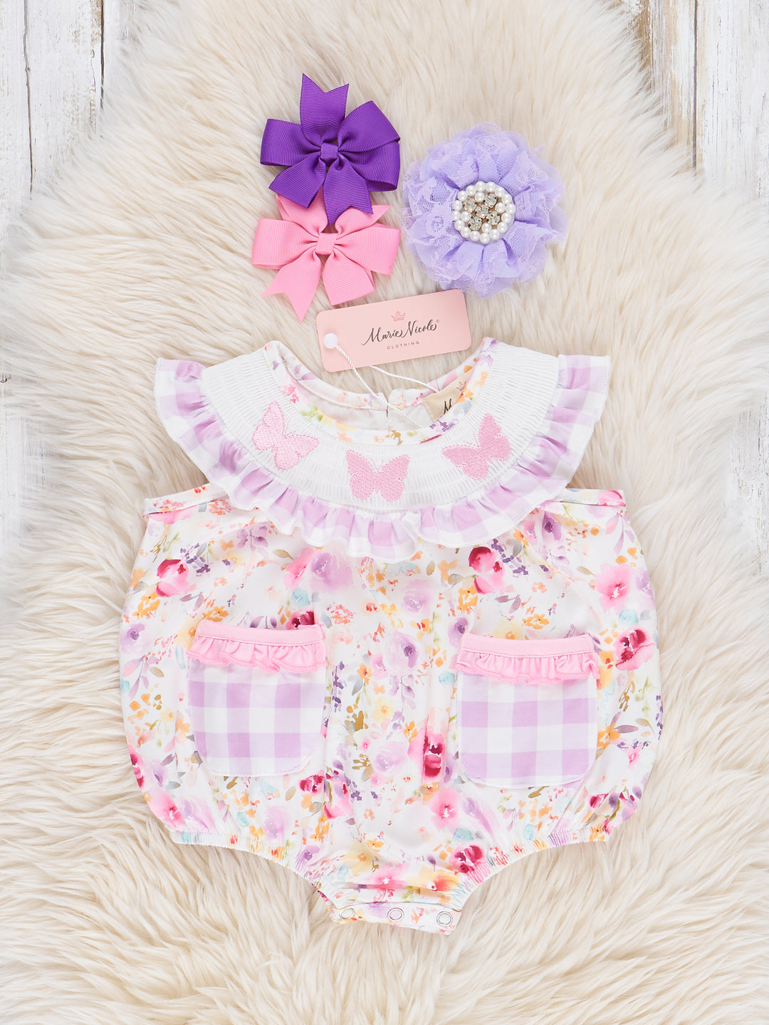 Transform your little girl into a whimsical butterfly in our Lilac Butterfly Garden Smocked Bubble. With a charming garden print bodice and embroidered butterflies on a smocked collar, she'll flutter around in style.