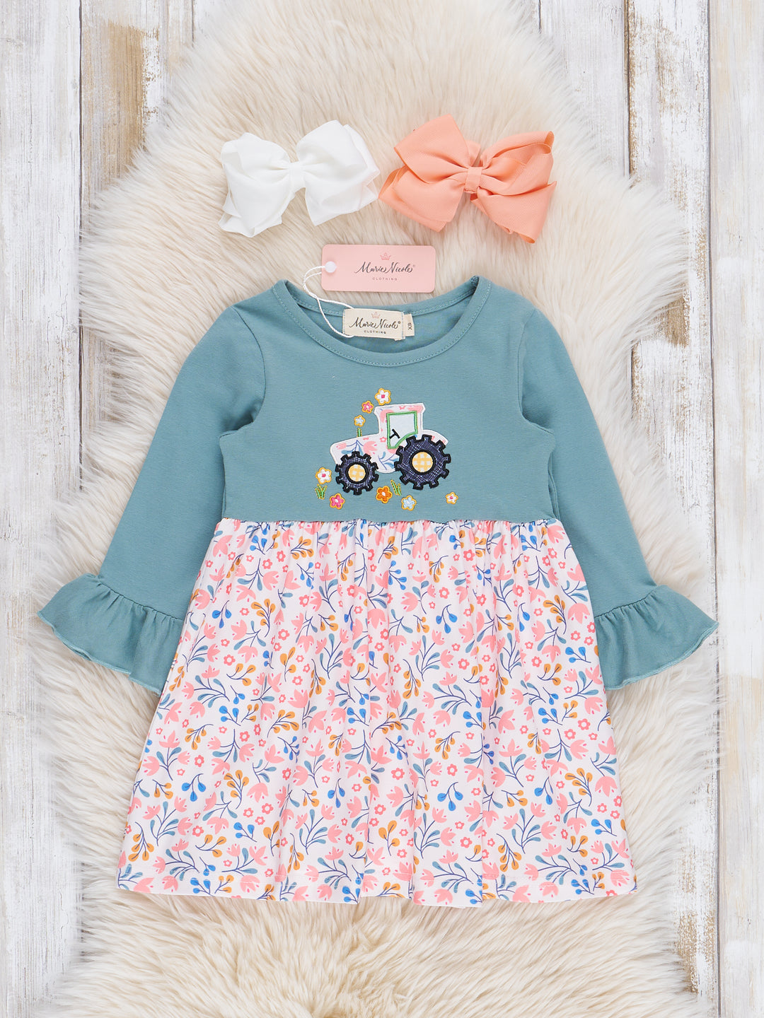 Get ready for some serious fun in our Soft Teal Floral Embroidered Tractor Dress! This girls dress features a teal bodice with an embroidered floral tractor, perfectly matched with a blooming floral skirt. Perfect for sisters who want to match in style, this dress is sure to bring out their playful side. Yee-haw!